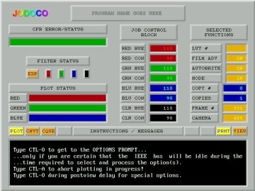 This GUI controls a program that sends image data to a film recording device. Plot Status progress bars show the data transfer in process. Note that color data is stored in Red, Green and Blue Field Files. The Dialogue Box displays useful information and instructions. |