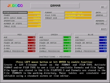 Here we have a GUI that controls a program allowing an operator to create brightness and contrast look-up tables to optimize using the full dynamic range of the film in use. In essence, this is a Gamma Correction program to calibrate the recording device and film combo. |
